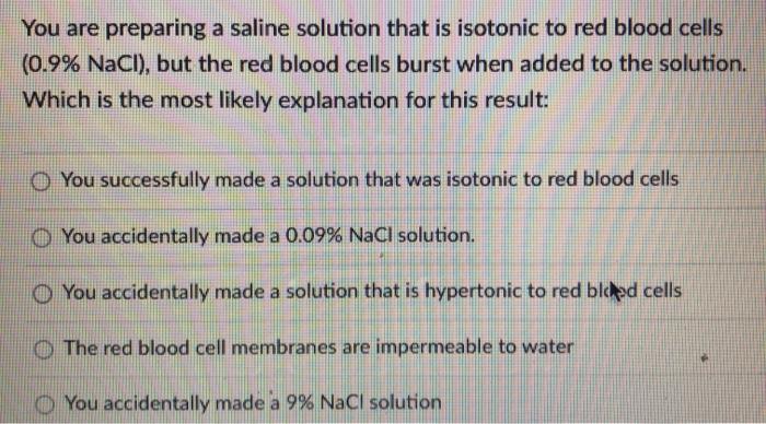 Solved 0 9 Glucose And 0 9 Nacl Are Select One Hypotonic Isotonic B Hypotonic Isotonic Hyperlonic Hypertonic Hypotonic Hypotonic Isolonic Isotonic And To Red Blood Cells